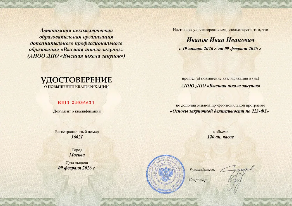 Вы получаете официальное удостоверение о повышении квалификации. Высшая школа закупок (fz44.org) в обязательном порядке вносит сведения об обучении в Саратове в реестр ФИС ФРДО, подтверждая легитимность вашей подготовки перед контролерами.